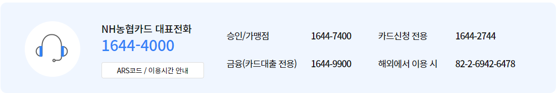 농협카드 고객센터 대표전화는 1644-4000입니다. 승인/가맹점의 경우 1644-7400, 카드신청 전용의 경우 1644-2744, 금융(카드대출전용) 1644-9900, 해외에서 이용하는 경우 82-2-6942-6478로 연결을 하면 됩니다.