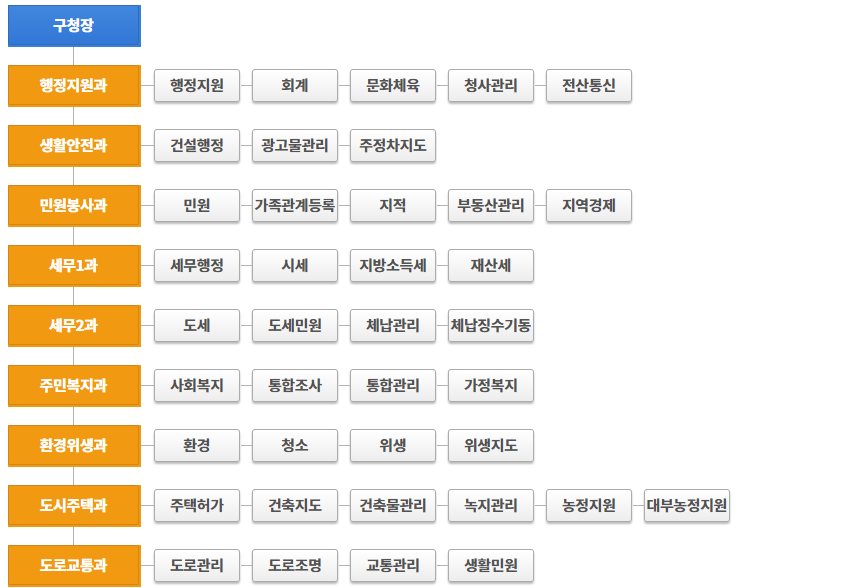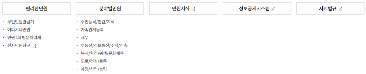 민원 관련 세부 메뉴들을 살펴보면 다음과 같습니다. 또한 전화번호 안내, 업무 및 직원검색, 조직도, 청사안내 등의 바로가기 메뉴를 알아보겠습니다.