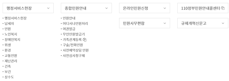 민원 관련 세부 메뉴들을 살펴보면 다음과 같습니다. 또한 전화번호 안내, 업무 및 직원검색, 청사안내, 오시는길 안내 등의 바로가기 메뉴를 알아보겠습니다. 조직도의 부서를 누르시면 전화번호 안내가 나옵니다.