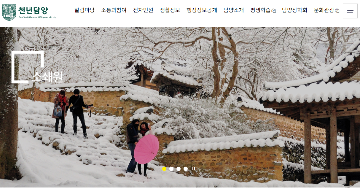담양군청 홈페이지의 메인 화면입니다. 많은 업무를 수행하는 군청이기 때문에 아주 다양한 메뉴들을 확인하실 수 있습니다. 주요 메뉴로는 알림마당, 소통과참여, 전자민원, 생활정보, 행정정보공개 등의 메뉴가 있습니다.