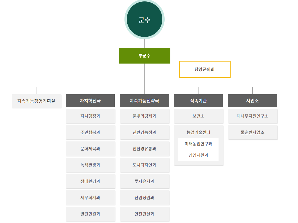담양군청은 군수 아래에 부군수가 있으며 그 아래의 조직으로는 자치행정과, 주민행복과, 문화체육과, 녹색관광과, 생태환경과, 세무회계과, 열린민원과 등의 부서가 있습니다.