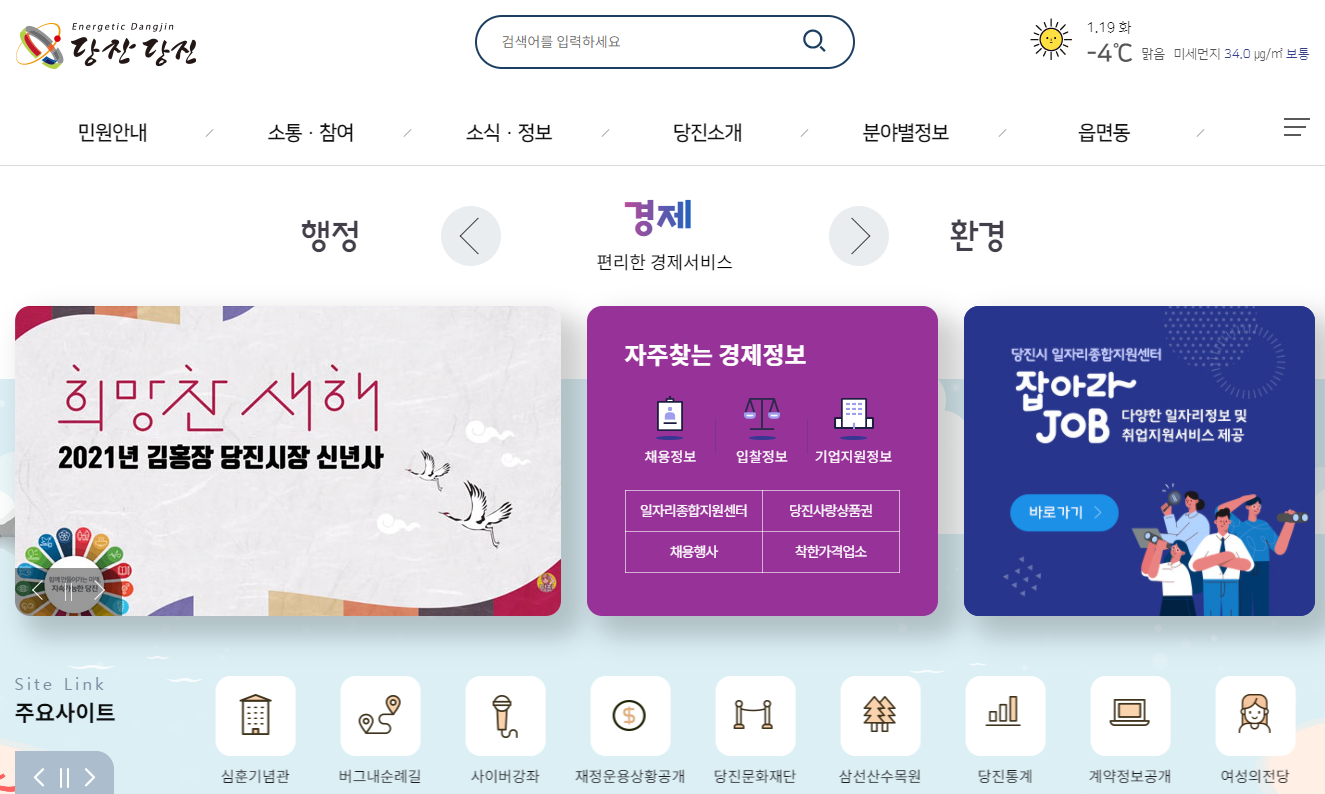 당진시청 홈페이지의 메인 화면입니다. 많은 업무를 수행하는 시청이기 때문에 아주 다양한 메뉴들을 확인하실 수 있습니다. 주요 메뉴로는 민원안내, 소통/참여, 소식/정보, 당진소개, 분야별정보의 메뉴가 있습니다.