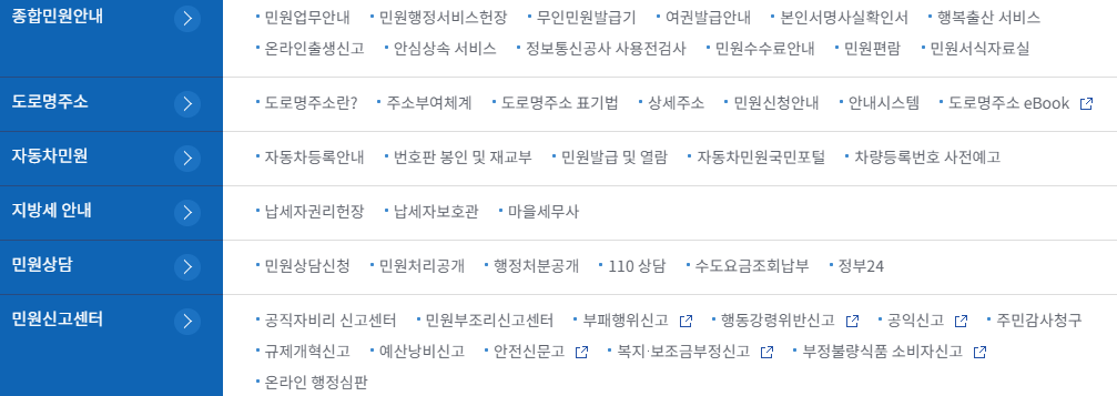 민원 관련 세부 메뉴들을 살펴보면 다음과 같습니다. 또한 전화번호 안내, 업무 및 직원검색, 조직도, 청사안내 등의 바로가기 메뉴를 알아보겠습니다.