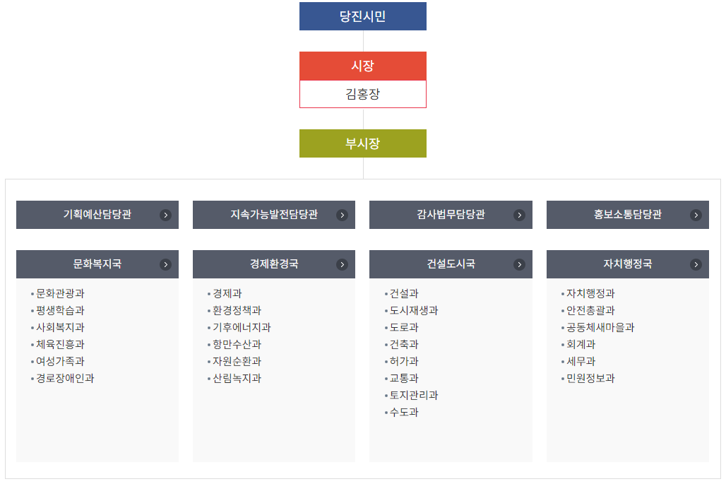 당진시청은 시장 아래에 부시장이 있으며 그 아래의 조직으로는 문화복지국, 경제환경국, 건설도시국, 자치행정국 등의 부서가 있습니다.