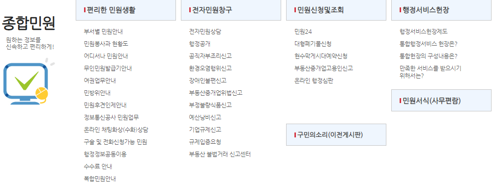 민원인이 많이 필요로 하는 세부 메뉴들을 살펴보면 다음과 같습니다. 조직 및 업무, 부서별 직원검색, 조직도, 청사안내 등이며 아래링크로 쉽게 확인하실 수 있습니다.