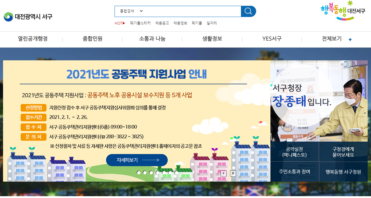 대전광역시 서구청에 대한 정보를 살펴보기 위해서는 서구청 홈페이지로 접속하시는 것이 가장 빠른 방법입니다. 검색사이트에서 서구청을 검색하시면 간단하게 접속이 가능합니다.