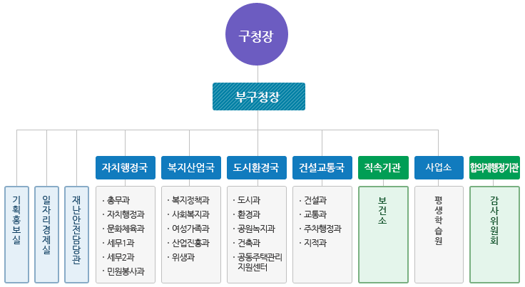 서구청은 구청장 아래에 자치행정국, 복지산업국, 도시환경국, 건설교통국, 보건소, 평생학습원, 감사위원회, 기획홍보실, 일자리경제실 등의 부서가 있습니다.