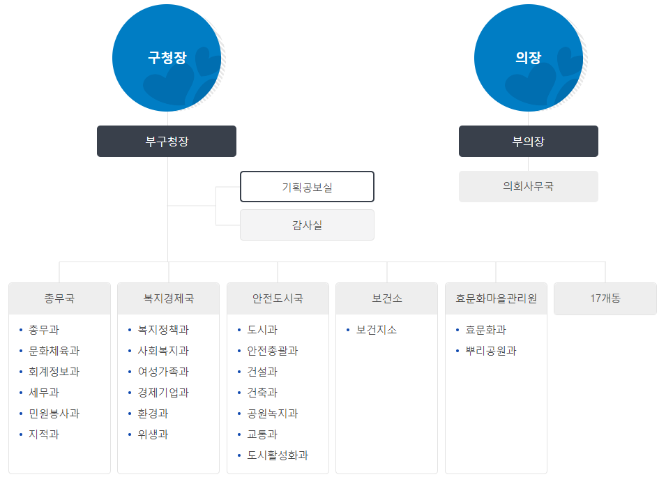 중구청은 구청장 아래에 총무국, 복지경제국, 안전도시국, 보건소, 효문화마을관리원, 기획공보실, 감사실 등의 부서가 있습니다.