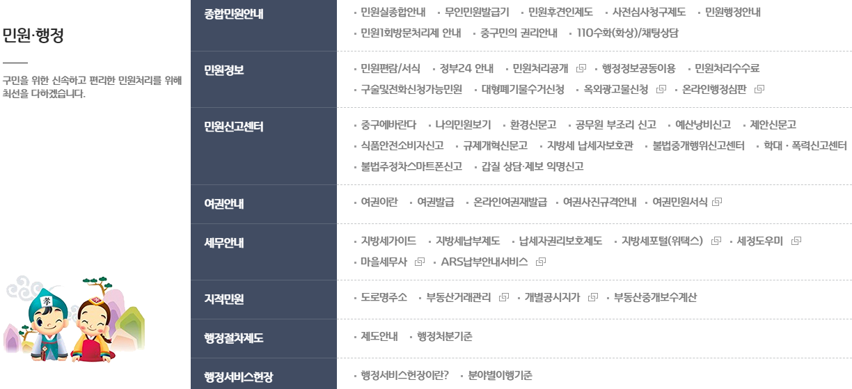 지금까지 중구청 홈페이지에서 제공하는 서비스를 간단히 살펴보았습니다. 구청 업무를 보시기 전에 미리 확인하시고 방문하시면 아주 많은 도움이 될 것입니다.
