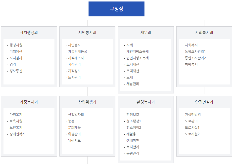 덕양구청은 구청장 아래에 자치행정과, 시민봉사과, 세무과, 사회복지과, 가정복지과, 산업위생과, 환경녹지과, 안전건설과 등의 부서가 있습니다.