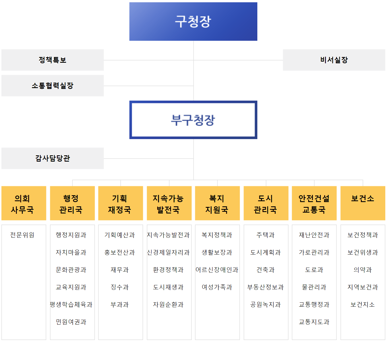 도봉구청은 구청장 아래에 부구청장이 있으며 그 아래의 조직으로는 의회사무국, 행정관리국, 기획재정국, 지속가능발전국, 복지지원국, 도시관리국, 안전건설교통곡, 보건소 등의 부서가 있습니다.