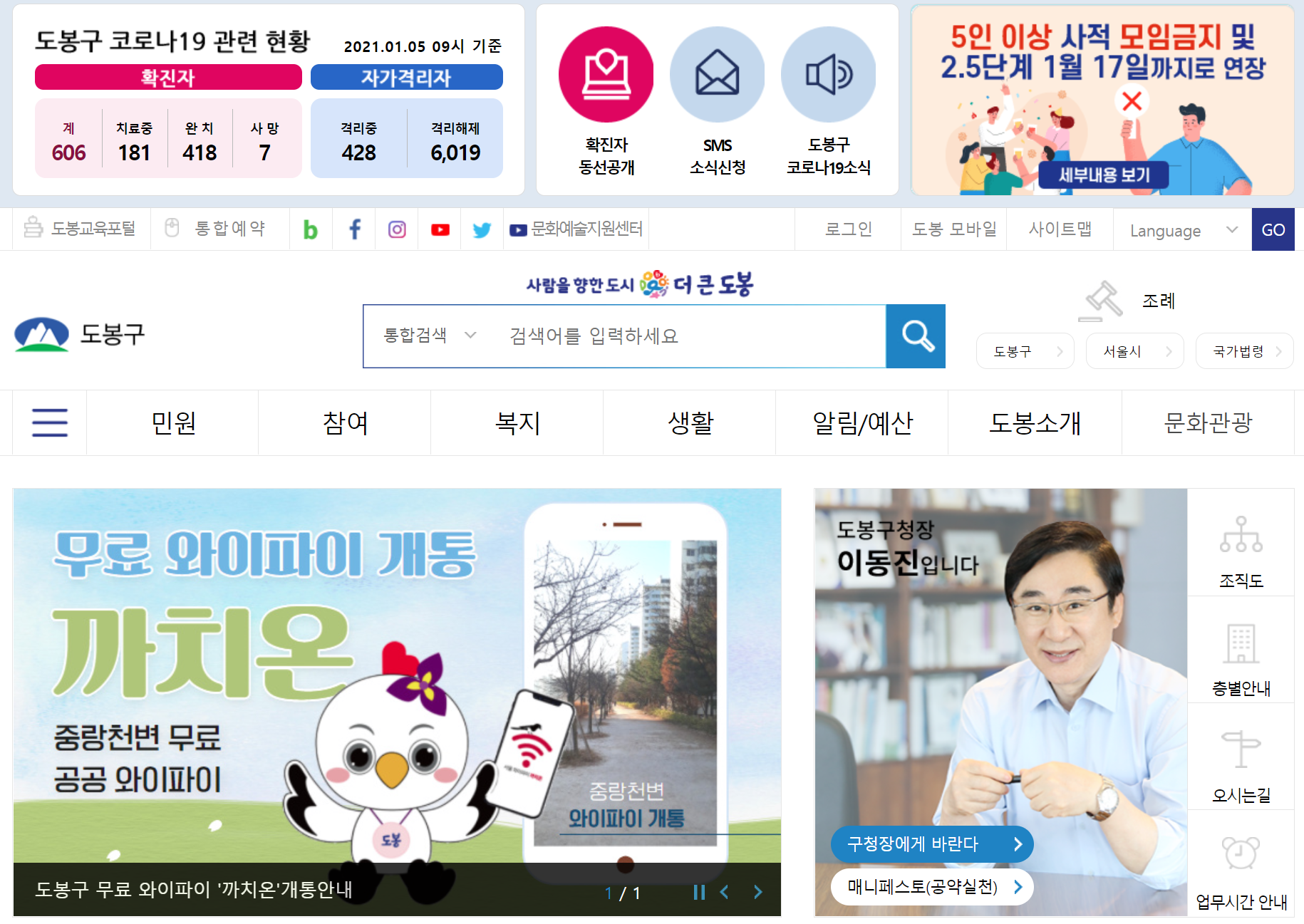 도봉구청을 자세히 살펴보기 위해서는 도봉구청 홈페이지로 접속하시는 것이 가장 빠른 방법입니다. 포털사이트에서 도봉구청을 검색하시면 간편하게 접속을 하실 수가 있습니다.