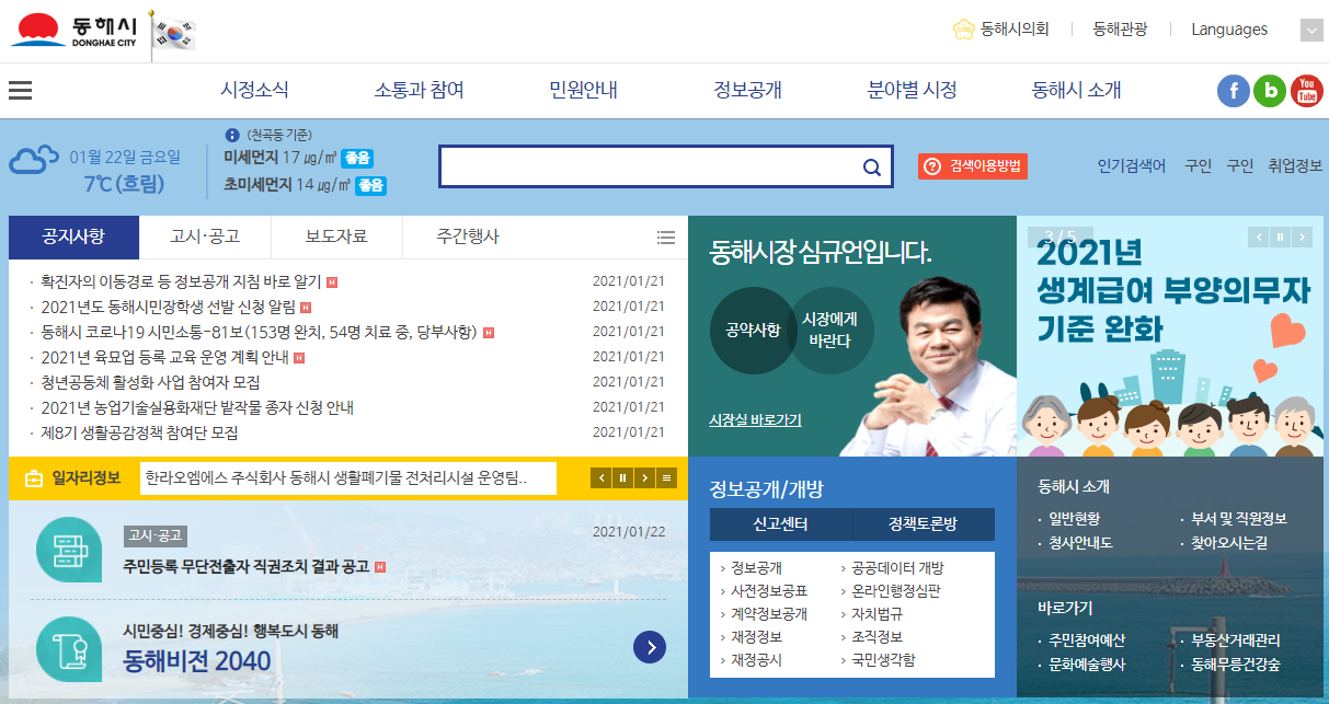 여기까지 동해시청 홈페이지에서 제공하는 정보들에 대해 간단히 살펴보았습니다. 시청 업무를 보시기 전에 미리 확인하시고 방문하시면 아주 많은 도움이 될 것입니다.