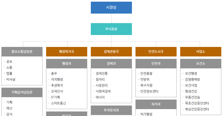 동해시청은 시장 아래에 부시장이 있으며 그 아래의 조직도로는 행정복지국, 경제관광국, 안전도시국, 사업소 등의 부서가 있습니다. 전체 조직도를 보시려면 아래 링크를 통해 간편하게 보실수가 있습니다.