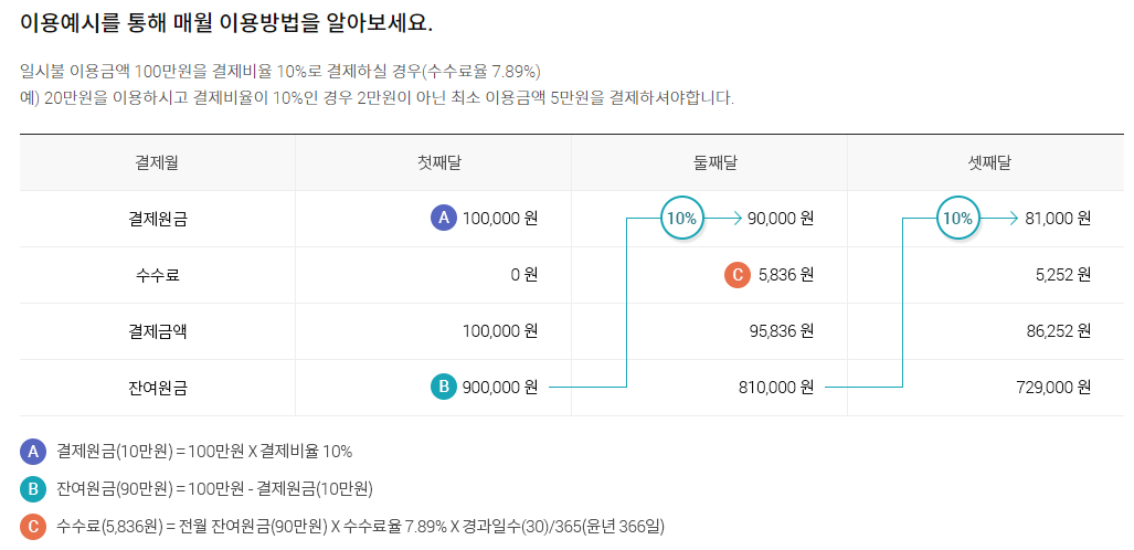 일시불로 100만원을 결제한 경우 리볼빙 결제비율이 10%라면 첫째 달에는 이용금액의 10%인 10만원이 결제되고 나머지 90만원이 이월됩니다.