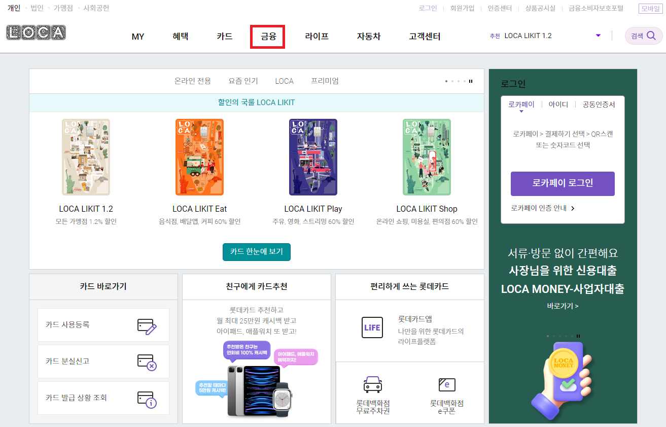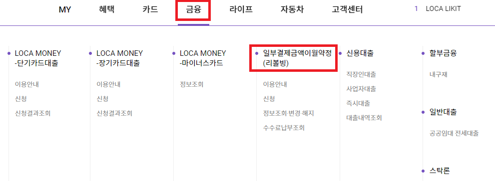 롯데카드 리볼빙에 대한 안내를 보기 위해서는 상단에 있는 금융메뉴를 선택합니다.