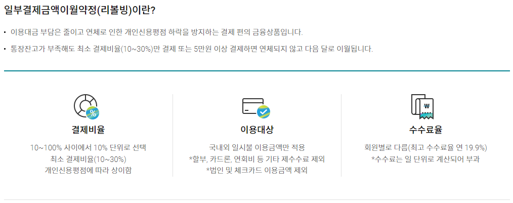 카드를 결제한 이용대금의 부담을 줄이고 대금 연체로 인한 개인신용평점 하락을 방지하기 위한 결제 편의 금융상품입니다. 통장잔고가 부족해도 최소 결제비율만 결제하거나 5만원 이상만 결제하는 경우 연체가 되지 않는 것입니다.