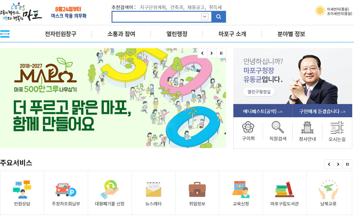 마포구청을 자세히 살펴보기 위해서는 마포구청 홈페이지로 접속하시는 것이 가장 빠른 방법입니다. 포털사이트에서 마포구청을 검색하시면 간편하게 접속을 하실 수가 있습니다.