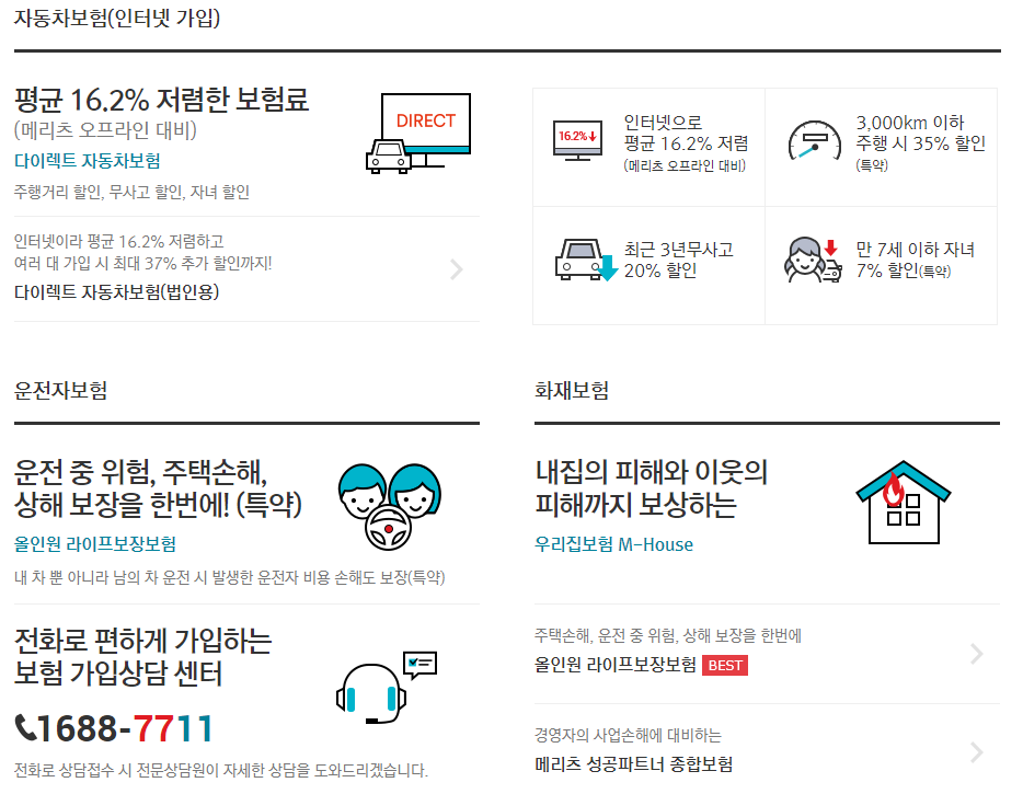 메리츠화재의 주요상품은 홈페이지를 통해 확인을 하면 다양한 정보를 정확하게 얻을 수가 있습니다. 먼저 자동차는 평균적으로 16.2% 저렴하게 만날 수 있으며, 여러대 가입시 최대 37%까지 추가 할인이 가능합니다.