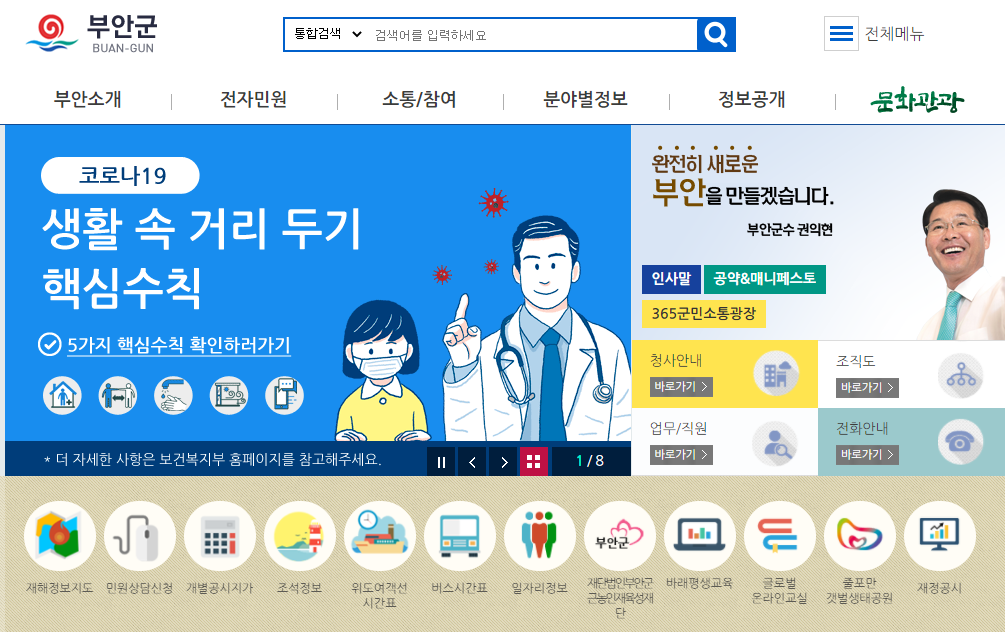 부안군청에 대해 자세히 살펴보기 위해서는 부안군청 홈페이지로 접속하시는 것이 가장 빠른 방법입니다. 포털사이트에서 부안군청을 검색하시면 간편하게 접속을 하실 수가 있습니다.