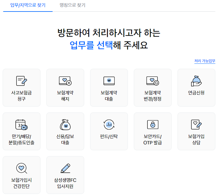 방문하기 전에 삼성생명 홈페이지에서 방문하여 처리하고자 하는 업무에 따라 이용 가능한 가까운 삼성생명 지점을 검색 후 방문하는 것이 좋습니다.