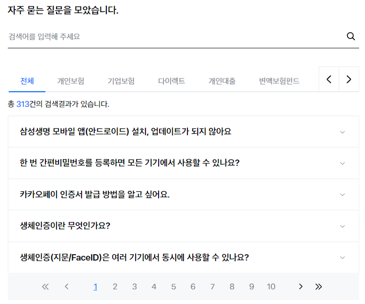 자주 묻는 질문에는 총 313건에 대해 개인보험, 기업보험, 다이렉트, 개인대출, 변액보험펀드 등으로 구분하여 상세하게 설명이 되어 있습니다.