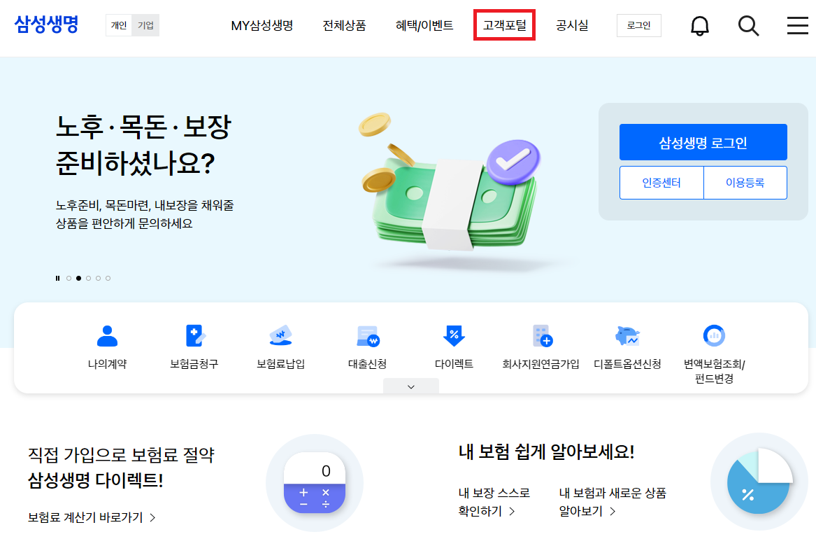 삼성생명 고객센터에 관한 정보를 확인하기 위해서는 대표 홈페이지로 접속을 한 다음 상단에 있는 고객포털 메뉴를 선택하면 됩니다.