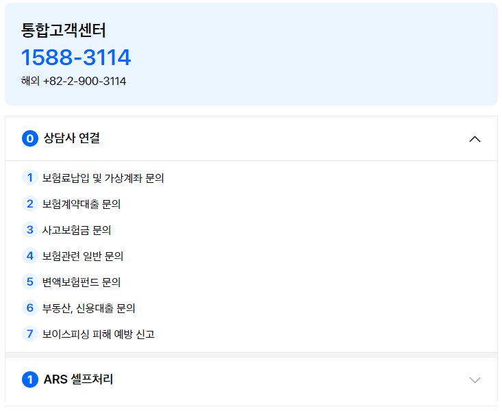 | 0번 : 상담사 연결 | 1번 : 보험료납입 및 가상계좌 문의 |