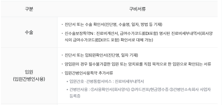 | 입원 (입원간병인사용) | · 진단서 또는 입퇴원확인서(진단명, 일자 기재) · 암입원의 경우 필수불가결한 입원 또는 암치료를 직접 목적으로 한 입원으로 확인되는 서류 |