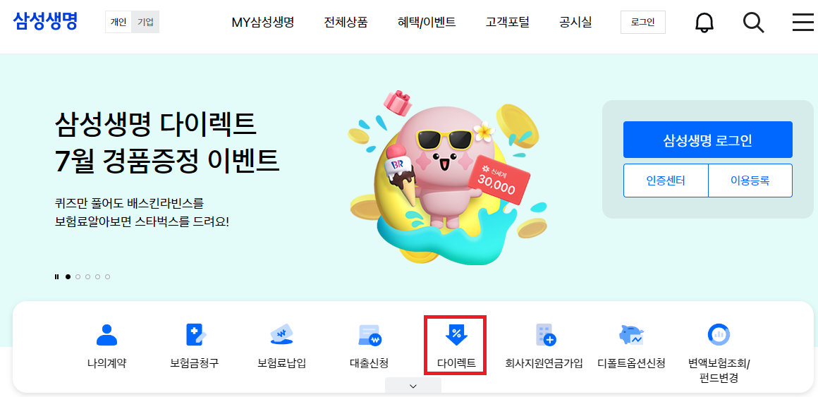 삼성생명 홈페이지 접속 후 아래와 같이 다이렉트를 선택해 줍니다.