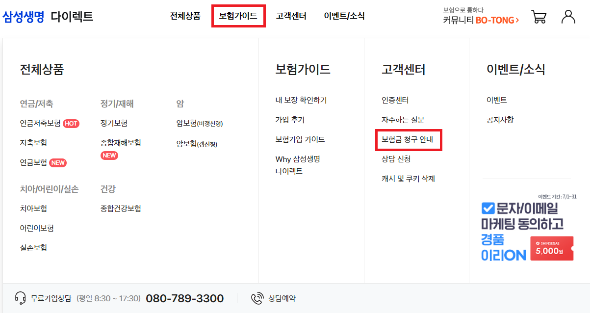 삼성생명 다이렉트 홈페이지로 이동후 상단에 있는 보험가이드를 선택하면 고객센터 메뉴를 통해서 보험금 청구 안내가 있는 것을 볼 수 있습니다.