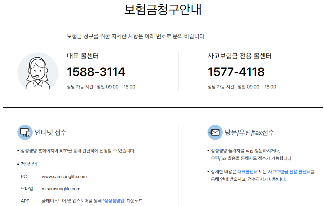 삼성생명 실비보험 보험금 청구 방법, 청구서류, 기타 문의 사항이 있는 경우 삼성생명 고객센터 전화번호를 통해 상담 또는 안내를 받을 수 있습니다.