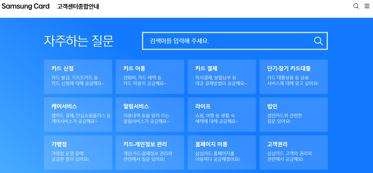 삼성카드를 이용하는 분들이라면 삼성카드 고객센터를 통해 해당 문의 내용 또는 필요한 정보를 확인하는 것이 좋습니다. 삼성카드 고객센터 홈페이지는 검색 또는 여기를 통해서 간편하게 접속이 가능합니다.