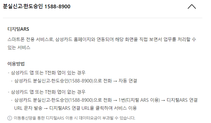 삼성카드 앱 또는 T전화 앱이 없는 경우에는 1588-8900으로 연결 후 1번(디지털 ARS이용), 디지털 ARS연결 URL 문자, 디지털 ARS연결 URL을 클릭하여 서비스를 이용하면 됩니다.