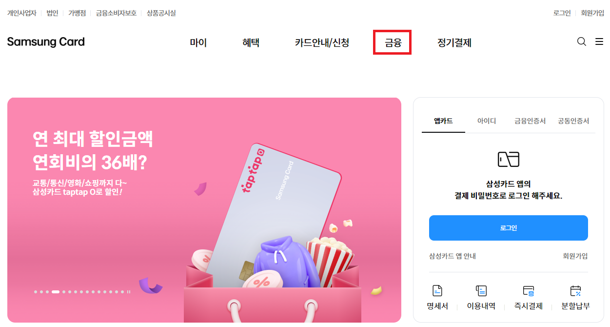 삼성카드의 리볼빙 서비스는 삼성카드 홈페이지를 통해 가장 정확하게 안내를 받을 수 있습니다. 먼저 삼성카드 홈페이지로 접속을 한 다음에 상단에 있는 금융 메뉴를 확인해 줍니다.
