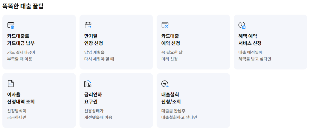 - 카드대출로 카드대금 납부 : 카드 결제대금이 부족할 때 이용