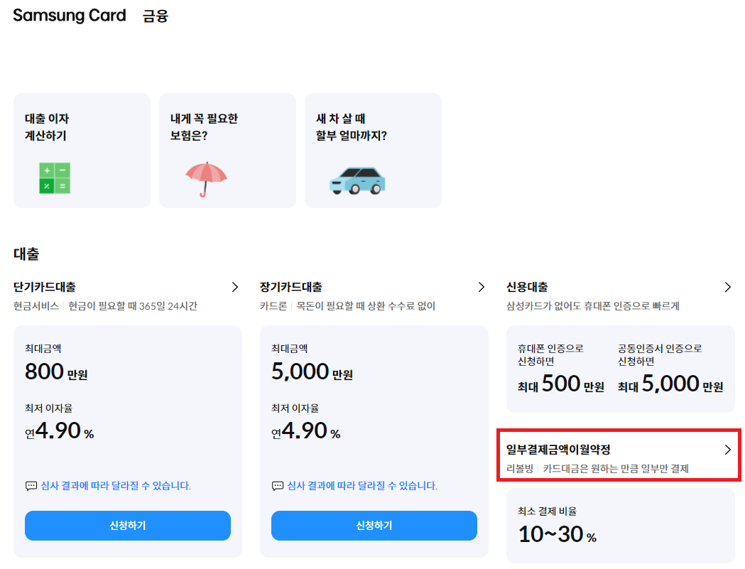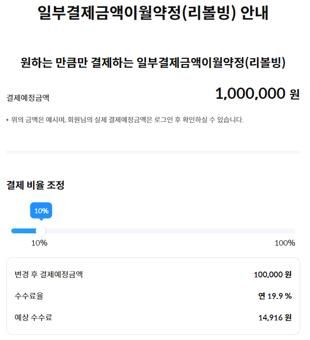 - 최소 결제비율 : 총 약정금액의 10~30%