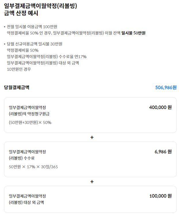 - 리볼빙 이월금액은 중도상환수수료 없이 즉시 상환이 가능하며, 상환 시점까지의 수수료는 일할로 산정됩니다.