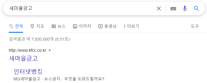 구글에서 새마을금고를 검색하면 가장 상단에 새마을금고 홈페이지가 나옵니다. 새마을금고는 지역금고마다 홈페이지가 다르기 때문에 지역금고를 이용하기 위해서 해당 홈페이지로 접속해야 합니다.