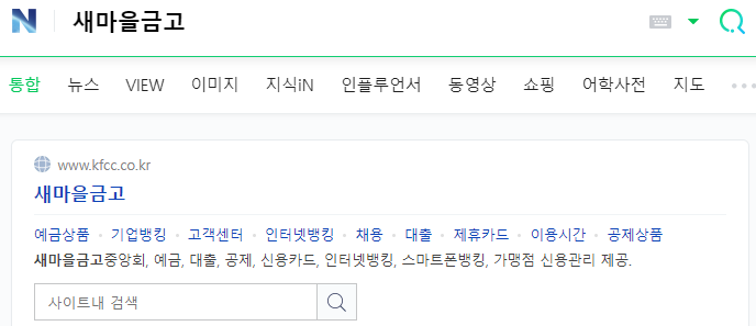 네이버에서 새마을금고를 검색하면 예금상품, 기업뱅킹, 고객센터, 인터넷뱅킹, 채용, 대출, 제휴카드, 이용시간, 공제상품 등에 대한 하위 메뉴까지 간단하게 검색 결과를 볼 수 있습니다.