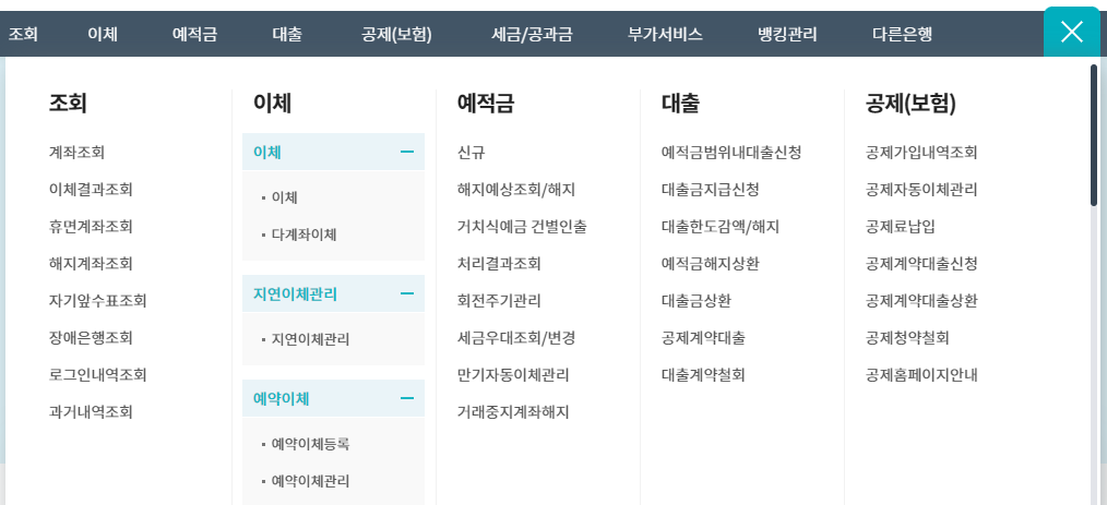 새마을금고를 이용중인 고객이라면 개인뱅킹을 이용하게 됩니다. 개인뱅킹 홈페이지는 조회, 이체, 예적금, 대출, 공제(보험) 세금/공과금, 부가서비스, 뱅킹관리, 다른은행 등의 메뉴를 이용할 수 있습니다. 우측 상단에 있는 전체 메뉴를 눌러보면 다양한 메뉴가 나옵니다.