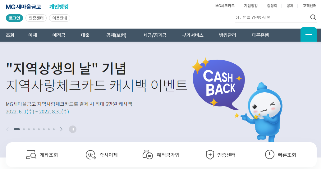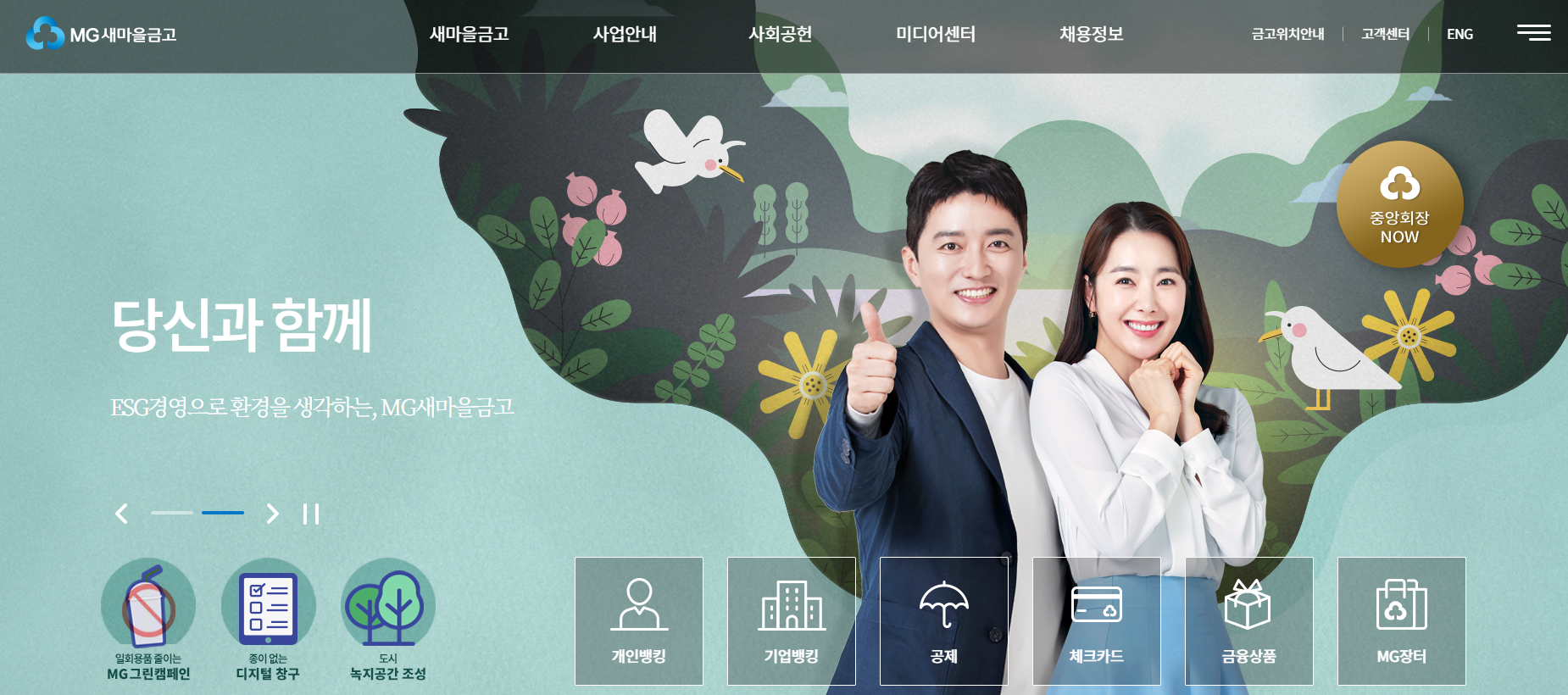 새마을금고 홈페이지로 접속을 하면 다음과 같음 메인화면이 나옵니다. 상단에는 새마을금고, 사업안내, 사회공헌, 미디어센터, 채용정보, 금고위치안내, 고객센터 등이 있습니다. 화면 중앙에는 빠른 이용을 위해서 개인뱅킹, 기업뱅킹, 공제, 체크카드, 금융상품, MG장터 메뉴가 있습니다.