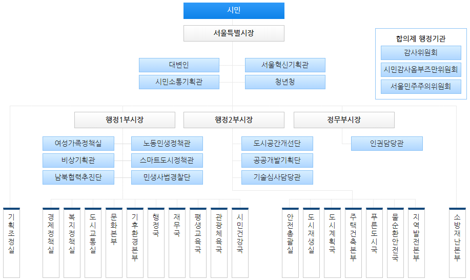 서울시청은 시민? 아래에 서울특별시장이 있으며 그 아래의 조직으로는 아래의 조직도에서 확인을 하실 수가 있습니다.