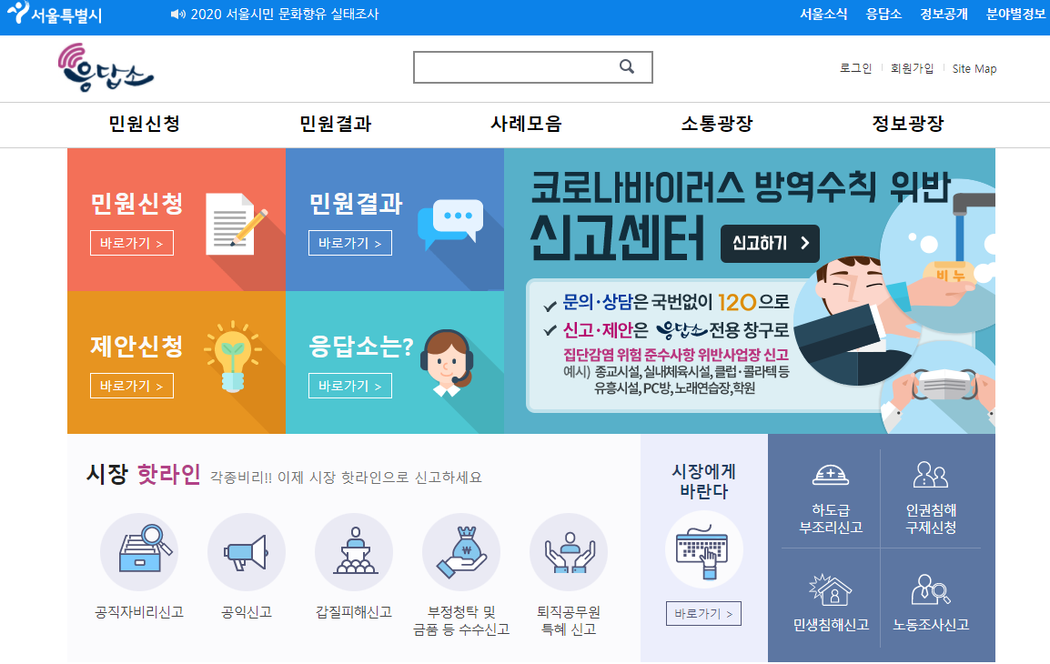 인터넷으로 편리하게 민원을 신청하실 수 있도록 서울시 전자민원 응답소 홈페이지를 운영하겠습니다. (http://eungdapso.seoul.go.kr/)