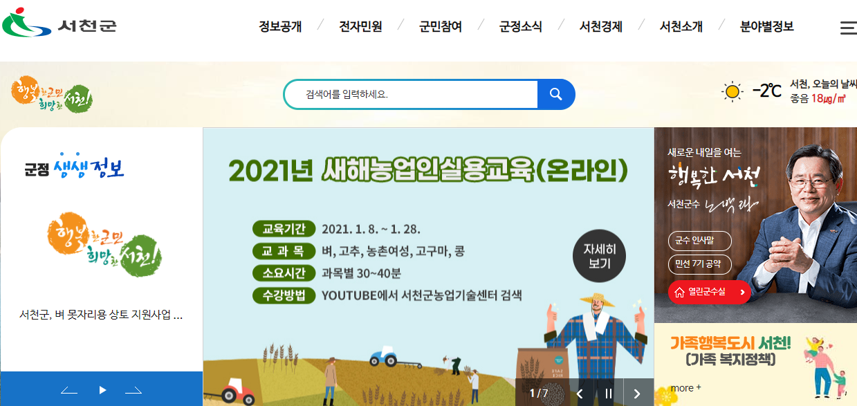 서천군청을 자세히 살펴보기 위해서는 서천군청 홈페이지로 접속하시는 것이 가장 빠른 방법입니다. 포털사이트에서 서천군청을 검색하시면 간편하게 접속을 하실 수가 있습니다.