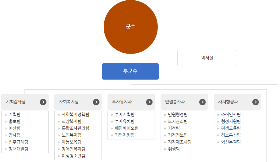 서천군청은 군수 아래에 부군수가 있으며 그 아래의 조직으로는 기획감사실, 사회복지실, 투자유치과, 민원봉사과, 자치행정과 등의 부서가 있습니다.