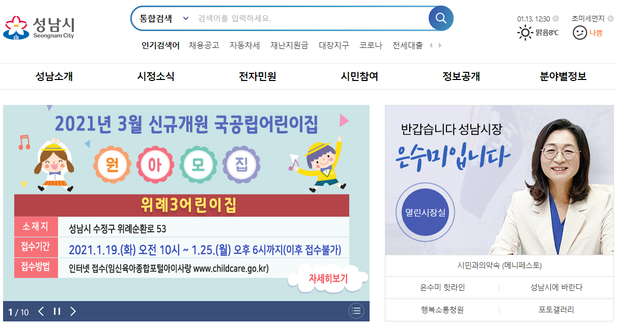 성남시청을 자세히 살펴보기 위해서는 성남시청 홈페이지로 접속하시는 것이 가장 빠른 방법입니다. 포털사이트에서 성남시청을 검색하시면 간편하게 접속을 하실 수가 있습니다.