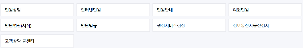 민원 관련 세부 메뉴들을 살펴보면 다음과 같습니다. 또한 전화번호 안내, 업무 및 직원검색, 조직도, 청사안내 등의 바로가기 메뉴를 알아보겠습니다.
