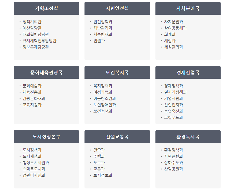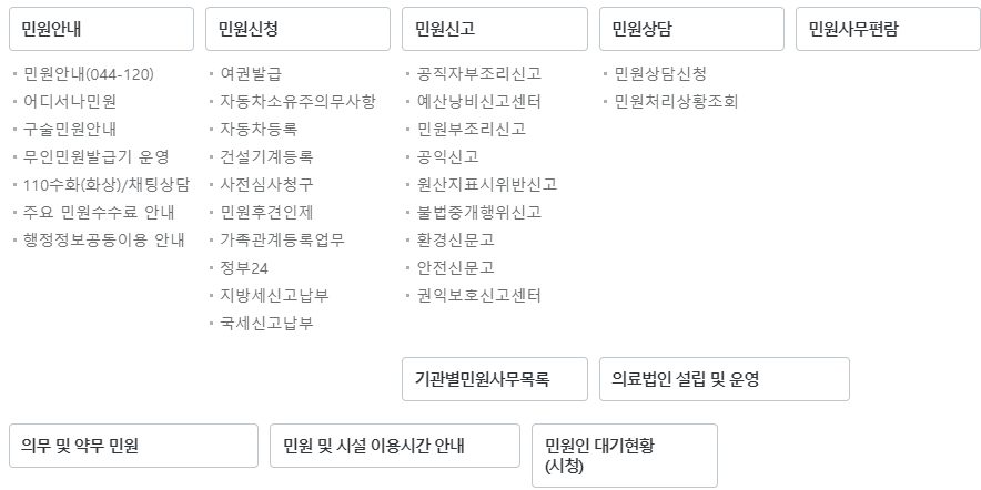 민원 관련 세부 메뉴들을 살펴보면 다음과 같습니다. 또한 전화번호 안내, 업무 및 직원검색, 조직도, 청사안내 등의 바로가기 메뉴를 알아보겠습니다.