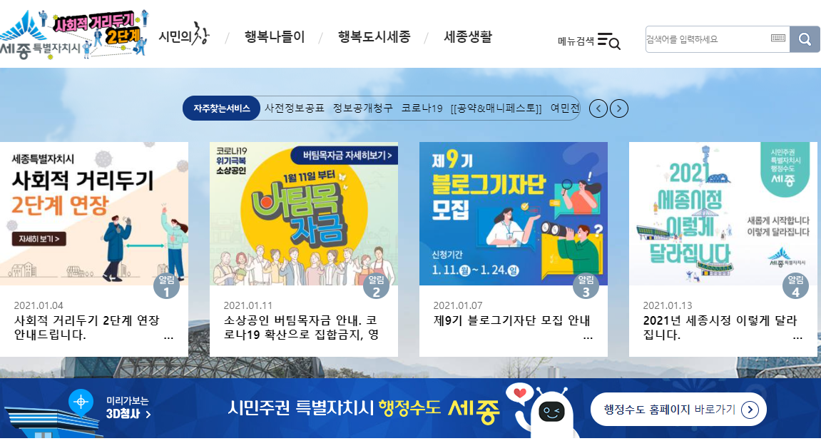 세종시청 홈페이지의 메인 화면입니다. 많은 업무를 수행하는 시청이기 때문에 아주 다양한 메뉴들을 확인하실 수 있습니다. 주요 메뉴로는 행복나들이, 행복도시세종, 세종생활의 메뉴가 있습니다.